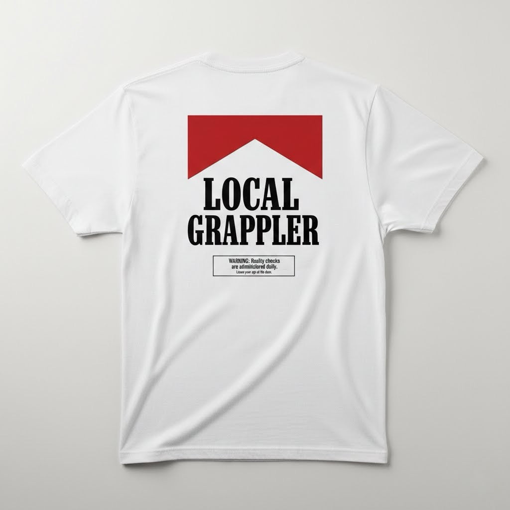 • Front: Features a clean, minimalist "Local Grappler" pocket-style graphic in our signature "Smoke" flip of the classic red chevron.